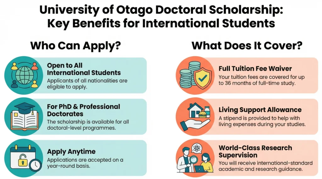 This guide provides a verified, accurate, and easy-to-understand overview of the University of Otago Doctoral Scholarships for the 2026–2027 academic cycle.